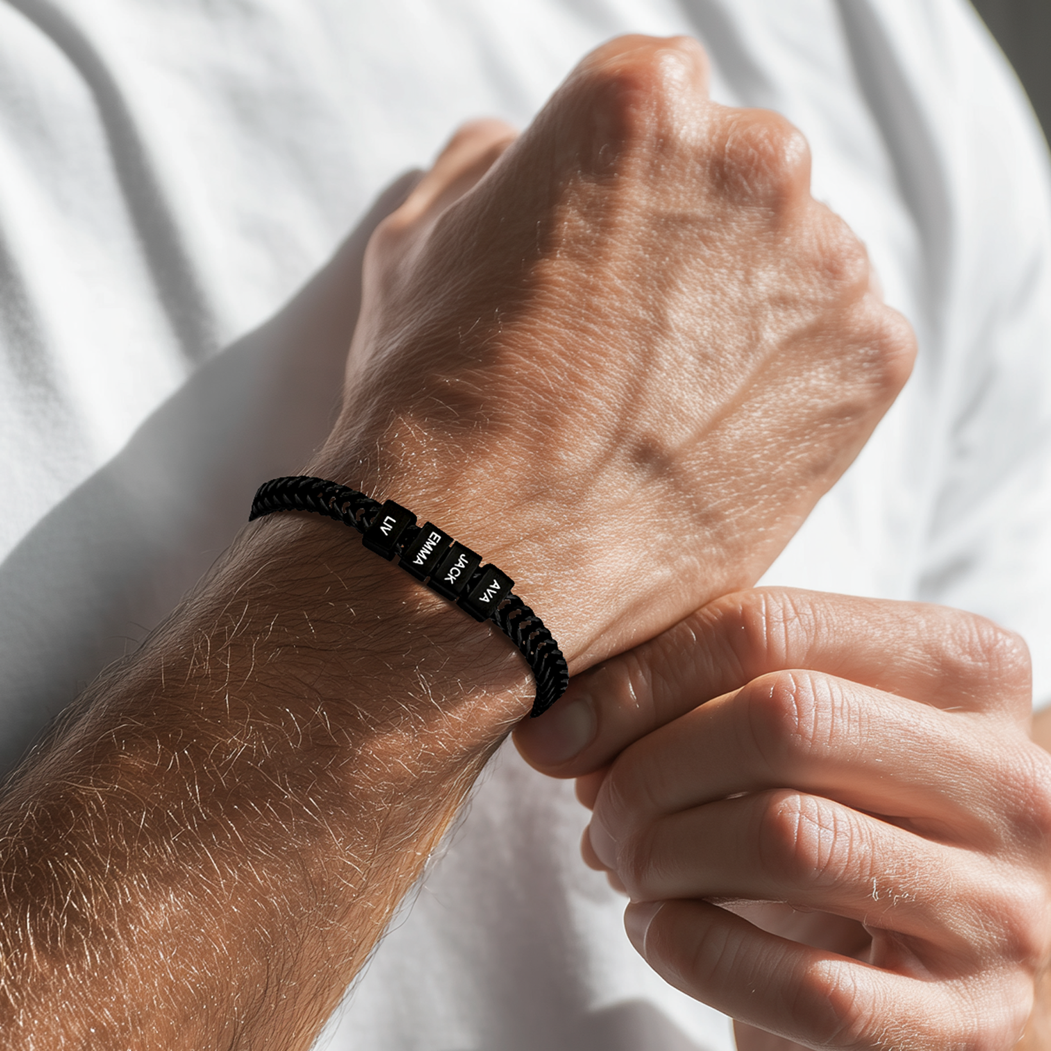 The black bracelet is custom engraved with children’s names and built for daily wear with a clean, masculine look.