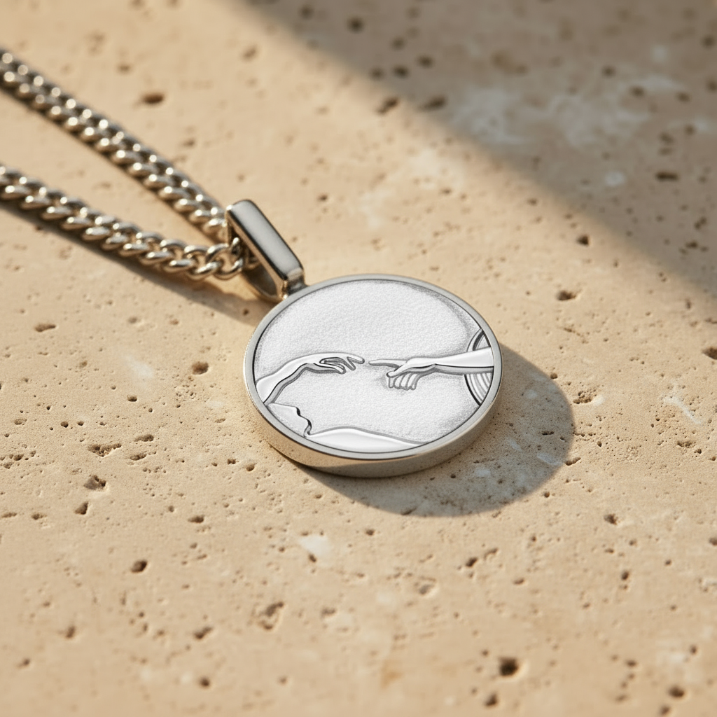 A necklace inspired by Michelangelo’s iconic “Creation of Adam,” capturing the moment God reaches out to touch man’s hand. Full of style and meaning, it symbolizes connection, inspiration, and the divine spark within us all. Perfect as a personal reminder or a thoughtful gift, it blends elegance with timeless significance.