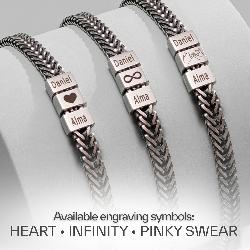 A meaningful and stylish gift for your man, personalized with engraved names. Made from high-quality, waterproof metal — perfect for everyday wear, even in the gym, pool, or shower.
