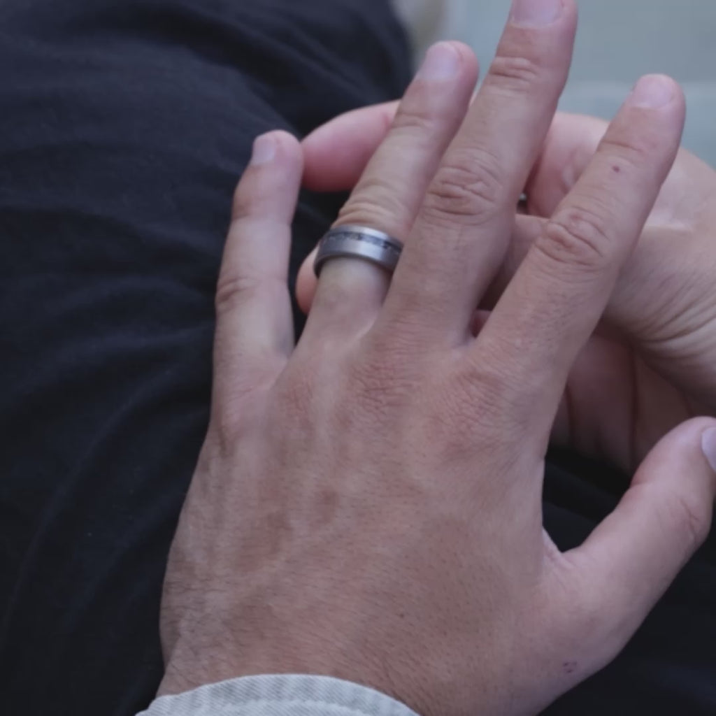 Inspired by this myth, this wedding band features an offset Gibeon meteorite inlay set within a forged tungsten carbide body. Each ring is crafted using only genuine meteorite. The iron fragments are precision-milled from a solid block of Gibeon meteorite and carefully set into the inlay, creating a truly distinctive and one-of-a-kind design.