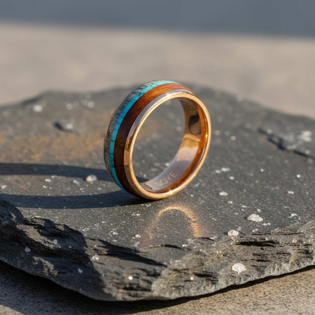 Crafted from premium tungsten with a polished rose gold finish, this ring embodies both strength and elegance. Its inlays of natural koa wood, turquoise, and antler create a perfect balance between rugged nature and refined design. Built to last a lifetime, it’s scratch-resistant, durable, and timeless — a true symbol of individuality and style.