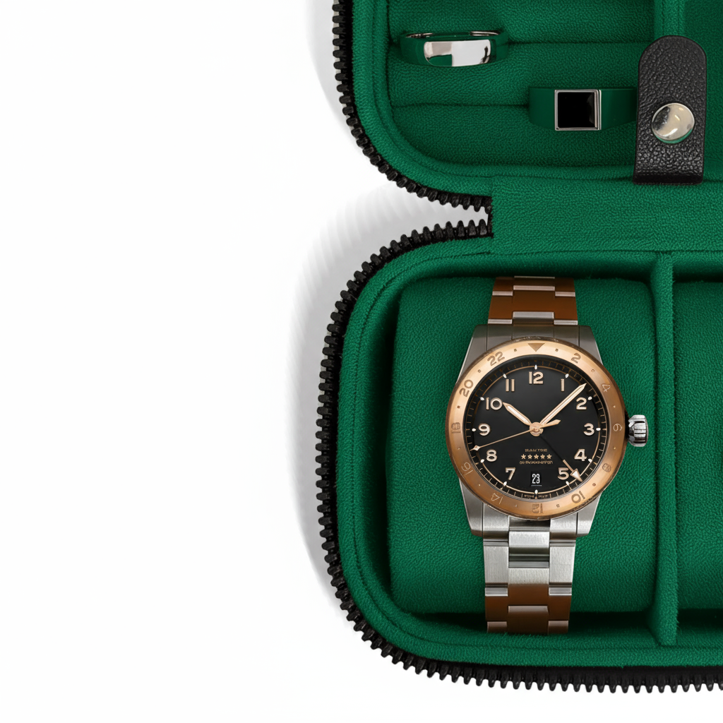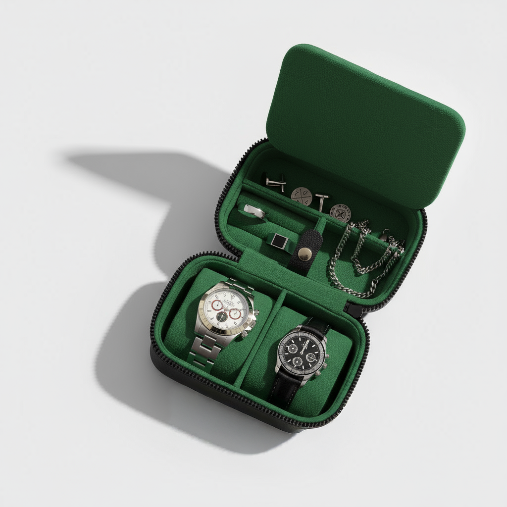 Travel in style with this elegant case designed to protect and organize your essentials. Featuring cushioned slots for two watches, compartments for rings, cufflinks, and bracelets, and a secure zip-around design, it keeps everything safe and organized. The deep green interior adds a timeless, sophisticated touch, making it perfect for business trips, vacations, or everyday storage.